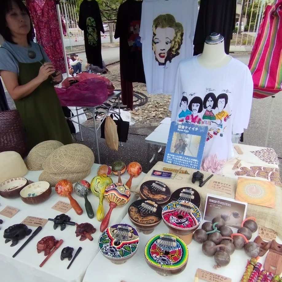 タイで直接吟味し買い付けした雑貨や衣料と、世界で活躍するミュージシャンの倍音ケイイチが実演販売する世界各地の変わった民族楽器「なぞ楽器」を販売しています。